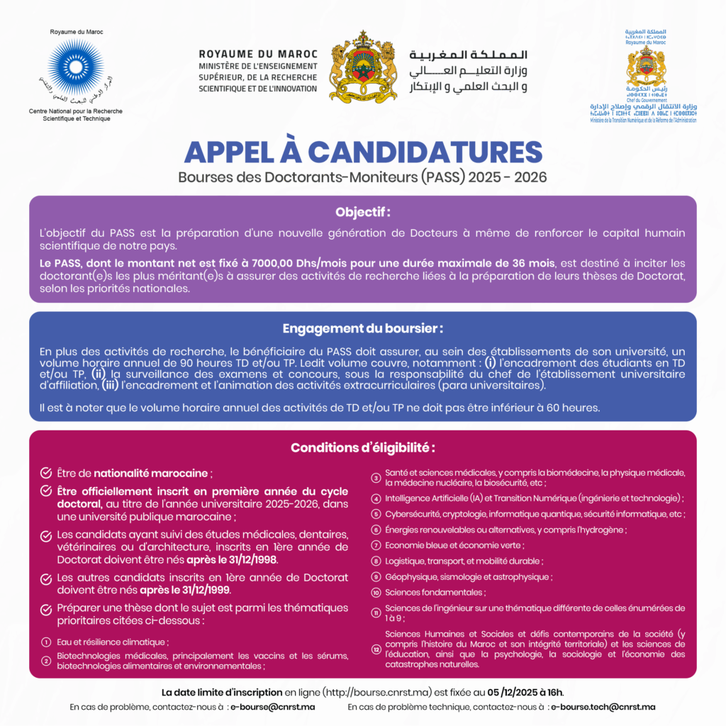 الرئيسية » سلك الدكتوراه » Appel à candidatures pour l’attribution des Bourses Doctorants Moniteurs « PhD-ASsociate Scholarship -PASS- » au titre de l’année universitaire 2025-2026