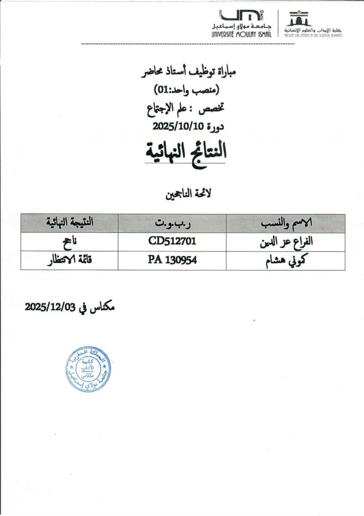 النتائج النهائية لمباراة توظيف أستاذ محاضر تخصص علم الاجتماع دورة 10-10-2025