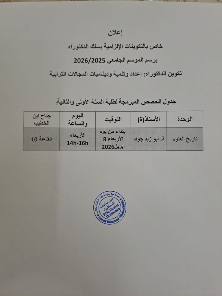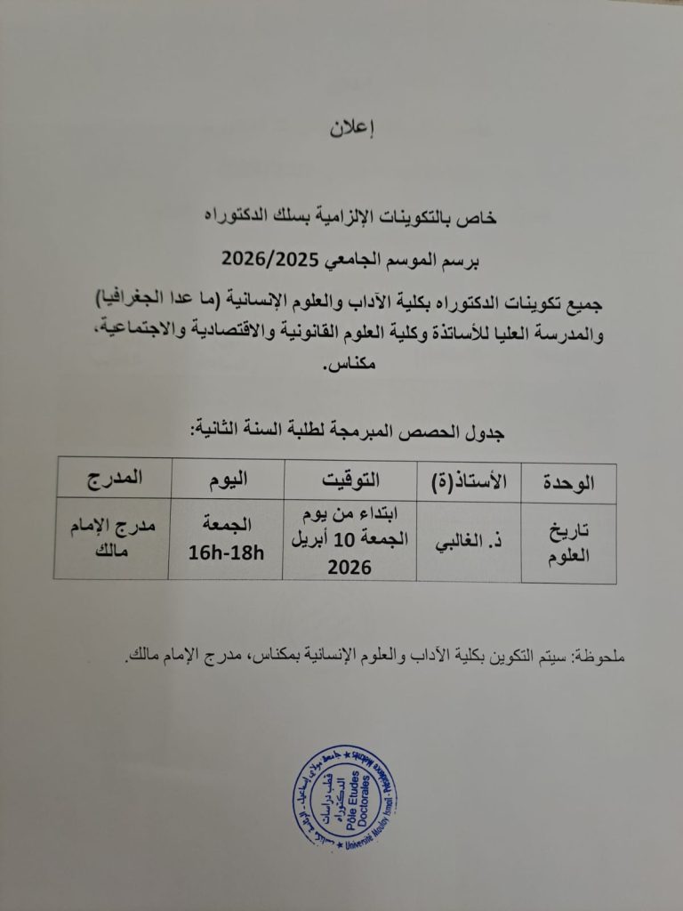إعـــلان خاص بالـتـكـويــنات الإلـزامـيـة بـسـلك الـدكـتـوراه بـرسـم الـمــوسـم الـجامعـي 2026/2025
